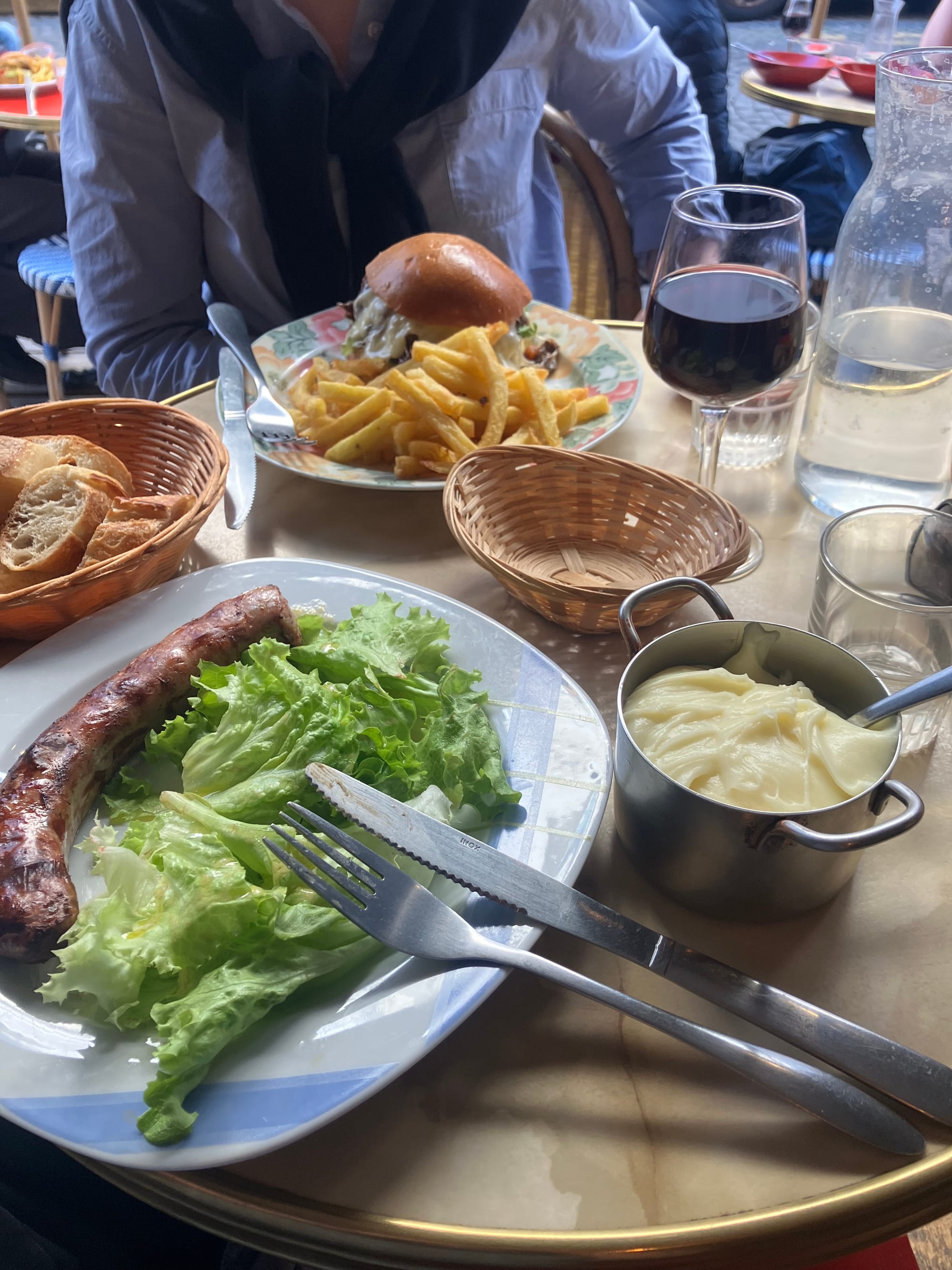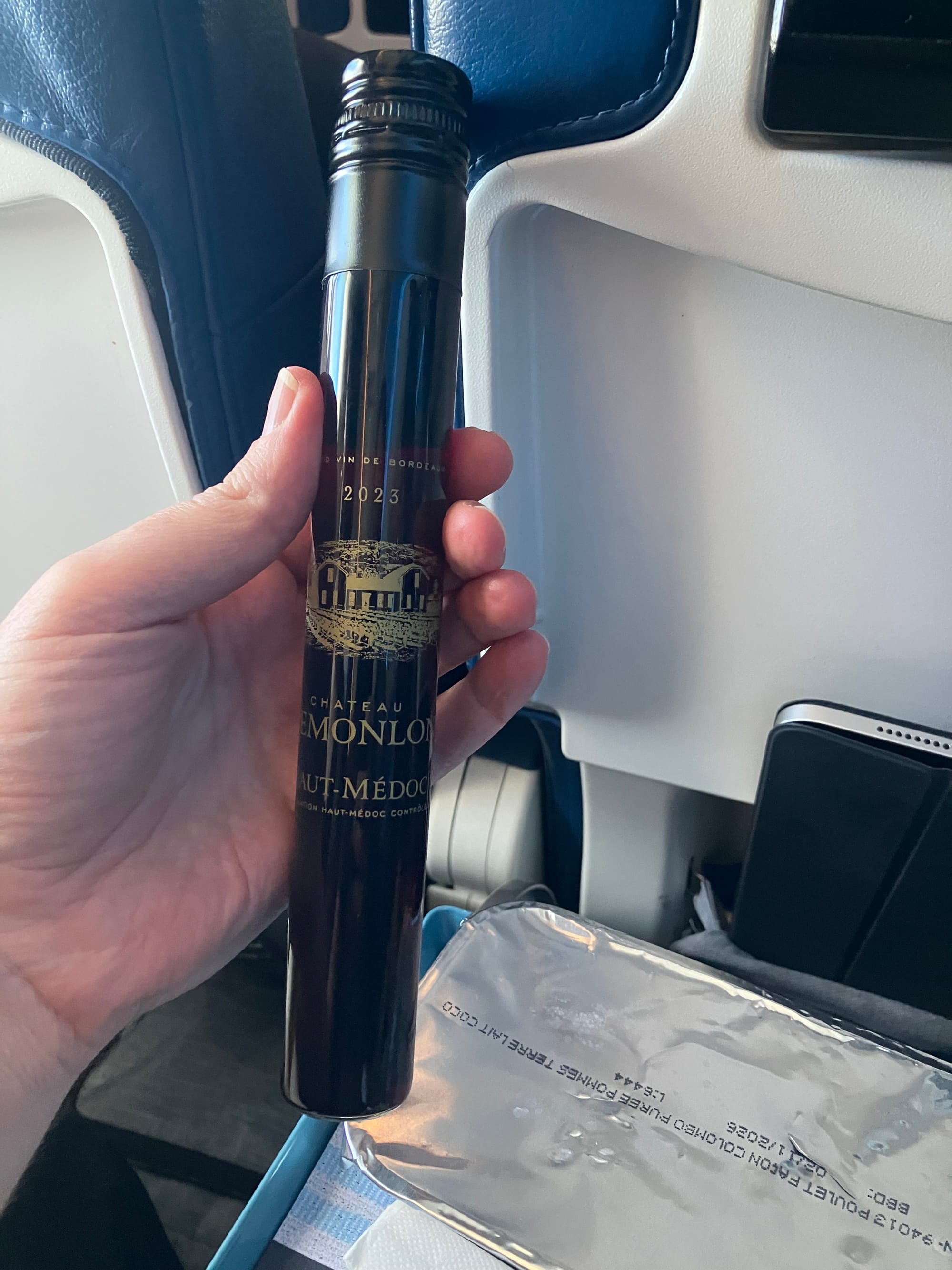 That side of the sausage is not mayonnaise but rather a melted cheese with a perfect viscosity for consuming with said sausage. I regretted this meal later but I would 100% eat it again. No less than three languages cultures occur at "La Cantine Russe". I always like to try foreign attempts at US cuisine and Parisians knocked it out of the park with that pile of egg/fried chicken/waffle. Finally, on the flight back I ordered a glass of wine and got a minor health potion.
